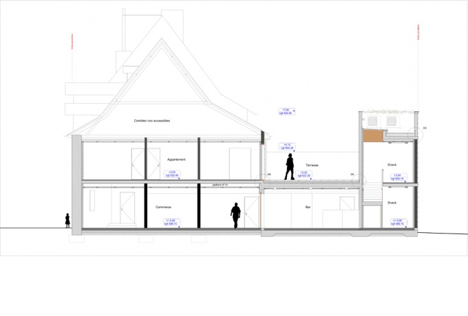 Ce travail des plus modeste par sa taille, son budget et son programme nous a permis toutefois d’introduire la question de l’architecture là où elle n’est pas forcément attendue. Ce projet, soutenu par l’architecte des bâtiments de France, pas toujours bien compris par une partie de la population, voir du conseil municipal, prévoyait la réhabilitation de l’ancienne Auberge des chasseurs abandonnée depuis de nombreuses années et la création d’un «multiple rural», ces espaces réunissant plusieurs activités pour palier la désertion des commerces en milieu rural.