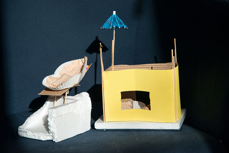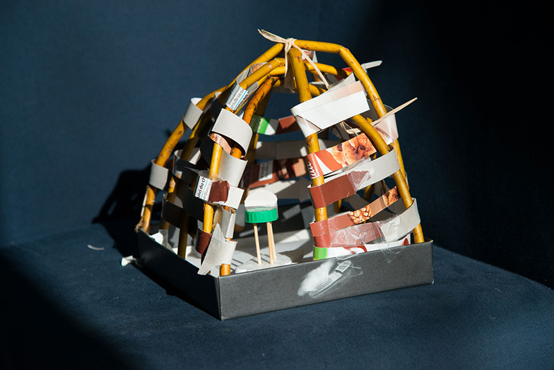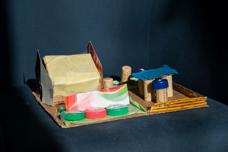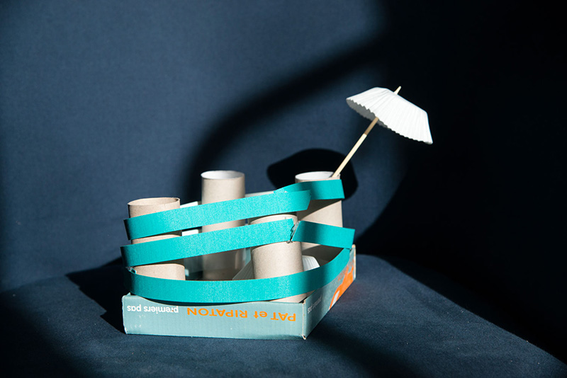 Le second atelier « maquettes » est l’occasion de tester un projet en volumes, d’expérimenter différentes techniques de construction. A partir de matériaux de récupérations du quotidien, les enfants imaginent les formes d’abris et d’assises qui pourraient prendre place dans lejardin.