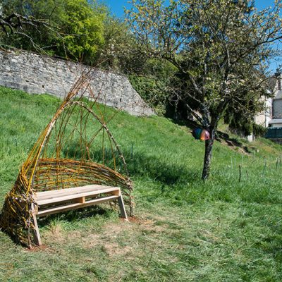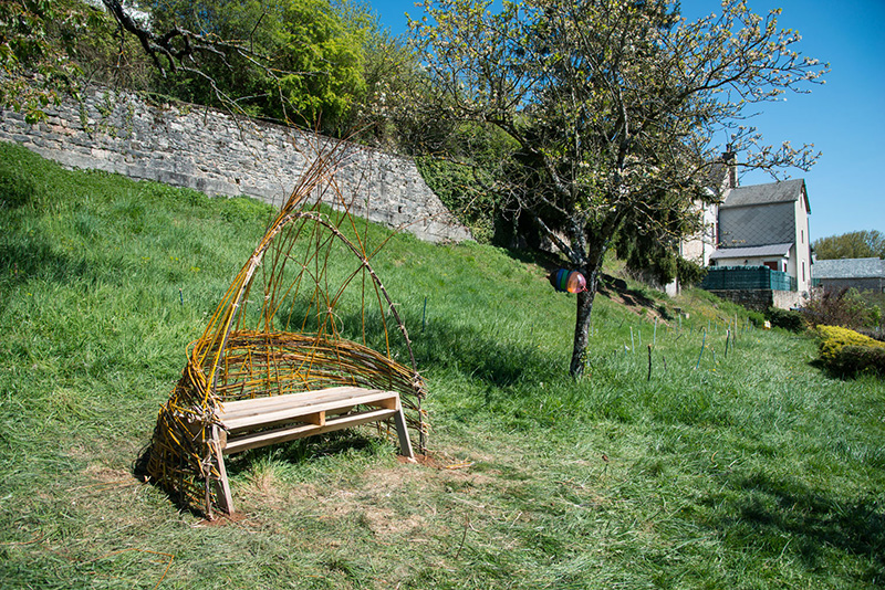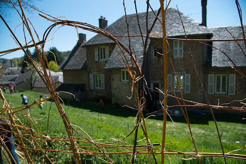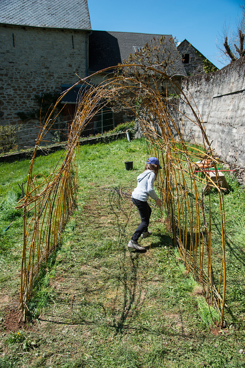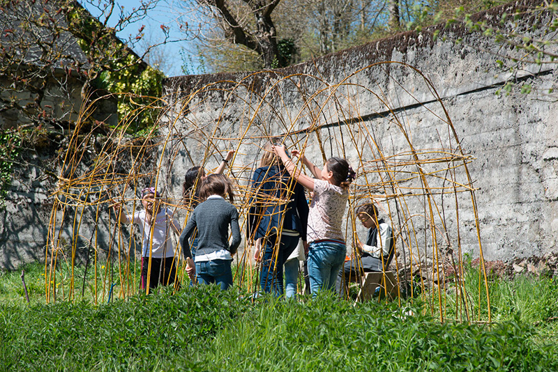 Après ce travail de réflexion, l’aménagement du jardin entre dans une phase concrète. Encadrés par l’équipe du C.A.U.E., les enfants organisent leur espace de jeux en construisant un tunnel et une tonnelle en osier vivant (technique de tressage de boutures de Saules).