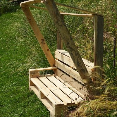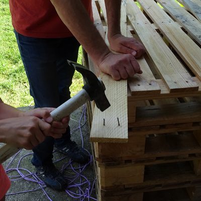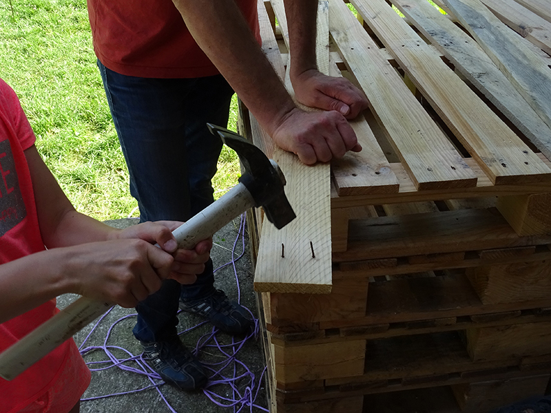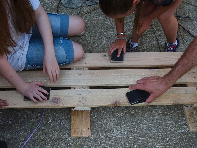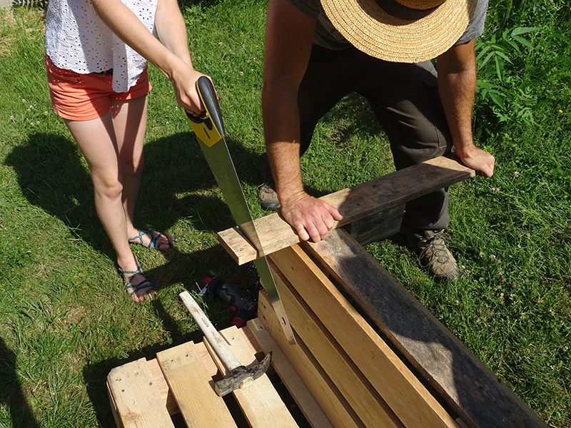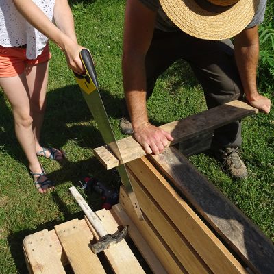 Pour finir, les élèves expérimentent la réalisation de mobiliers en matériaux de récupération (palettes en bois). Scier, poncer, clouer et assembler… tous participent à la réalisation des bancs et tables qu’ils installent en différents lieux du jardin.