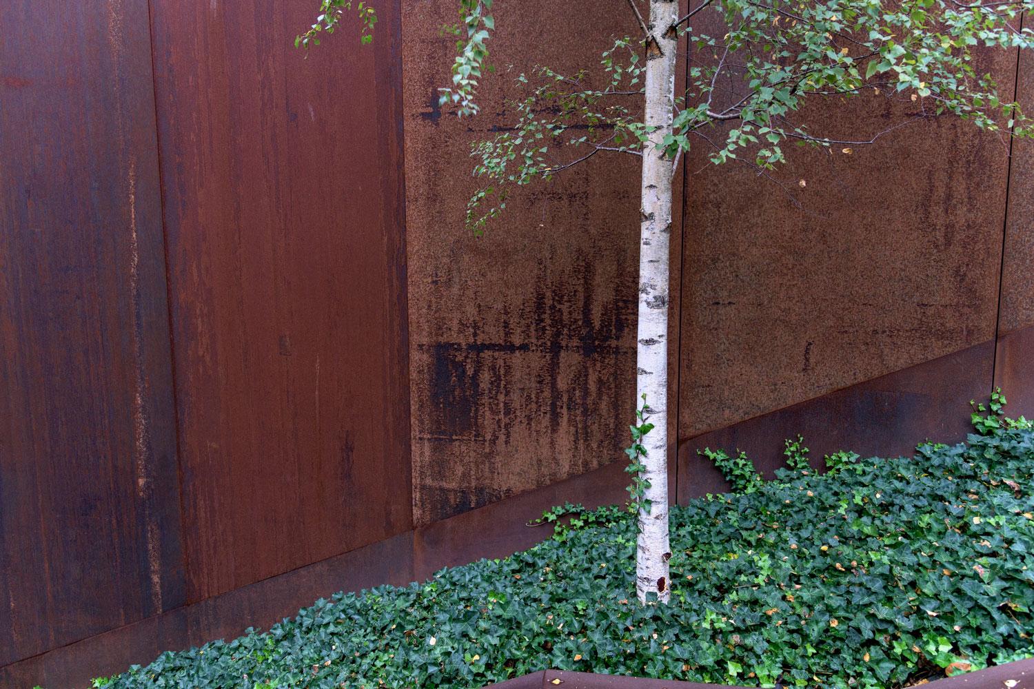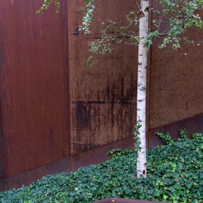 Le revêtement en acier Corten donne de la pureté aux volumes, les ouvertures ne sont pas perceptibles de l’extérieur. L’escalier et le talus couvert de lierre renforce cette perception du relief.