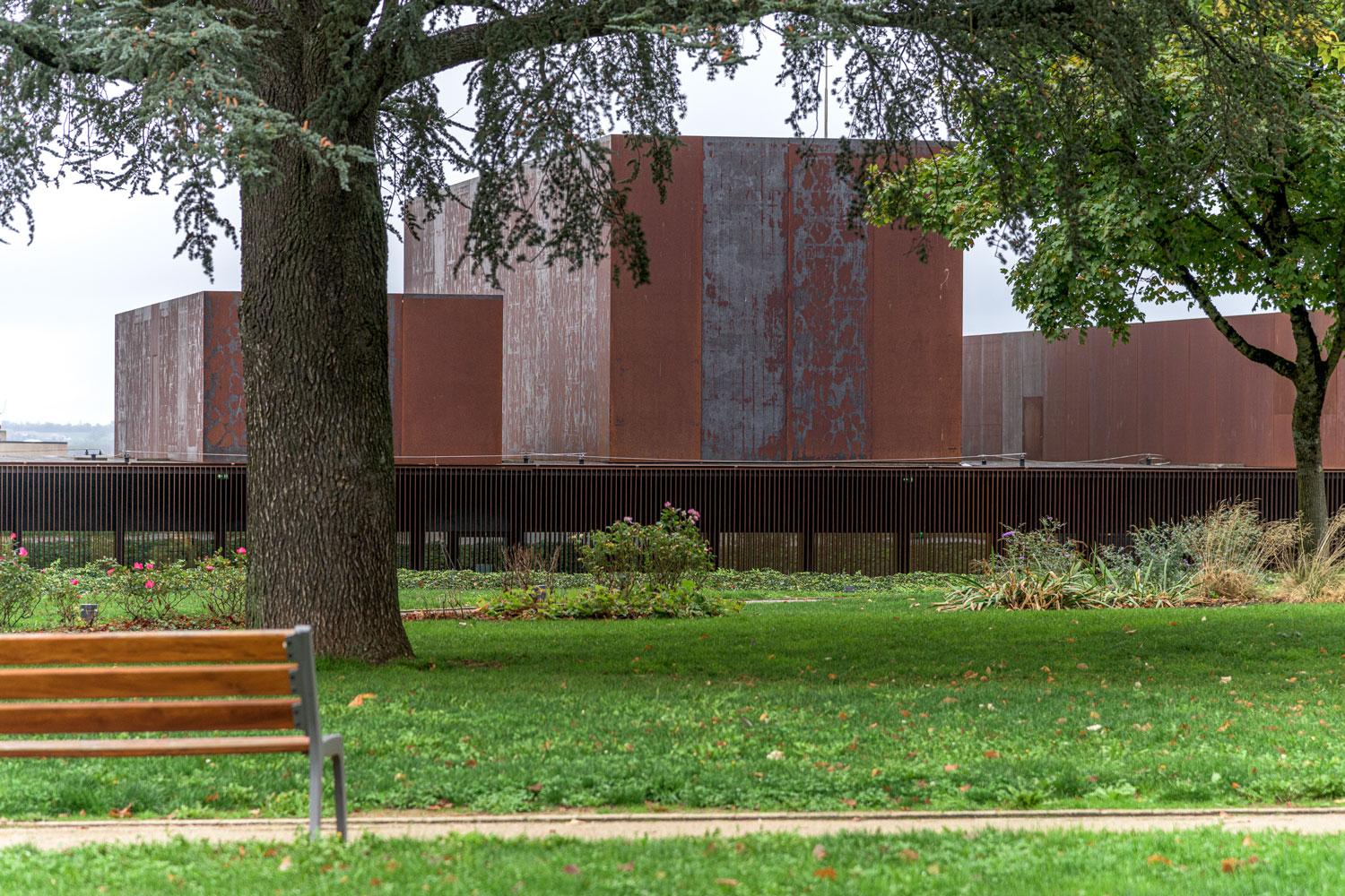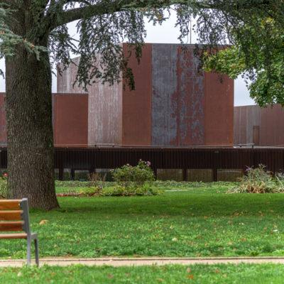 Vue depuis la contre-allée de l’avenue Victor Hugo, les différents volumes du bâtiment créent des fenêtres qui séquencent les vues sur l’horizon. Vue depuis l’allée, entre le musée et le rond-point de l’Amphithéâtre, l’implantation en balcon est magnifiée par les surplombs.