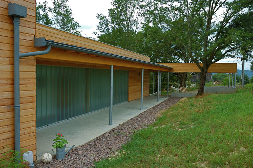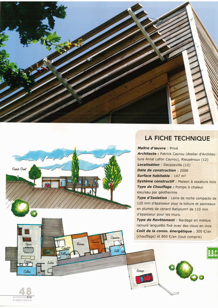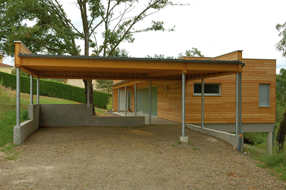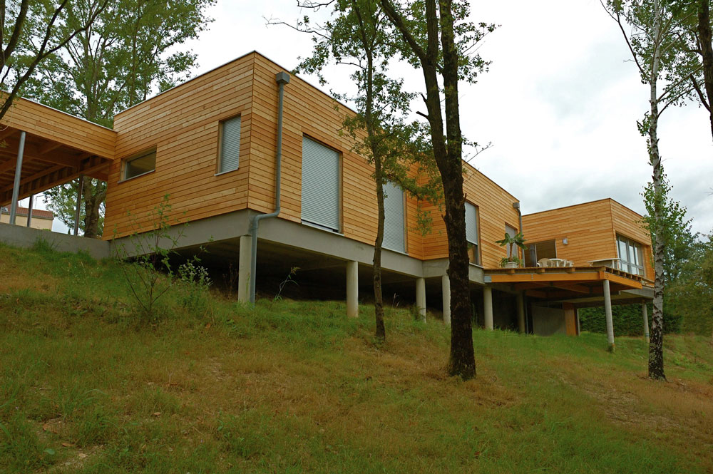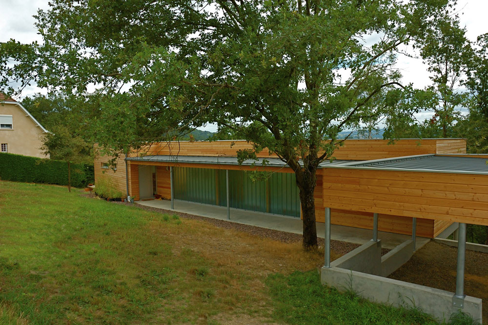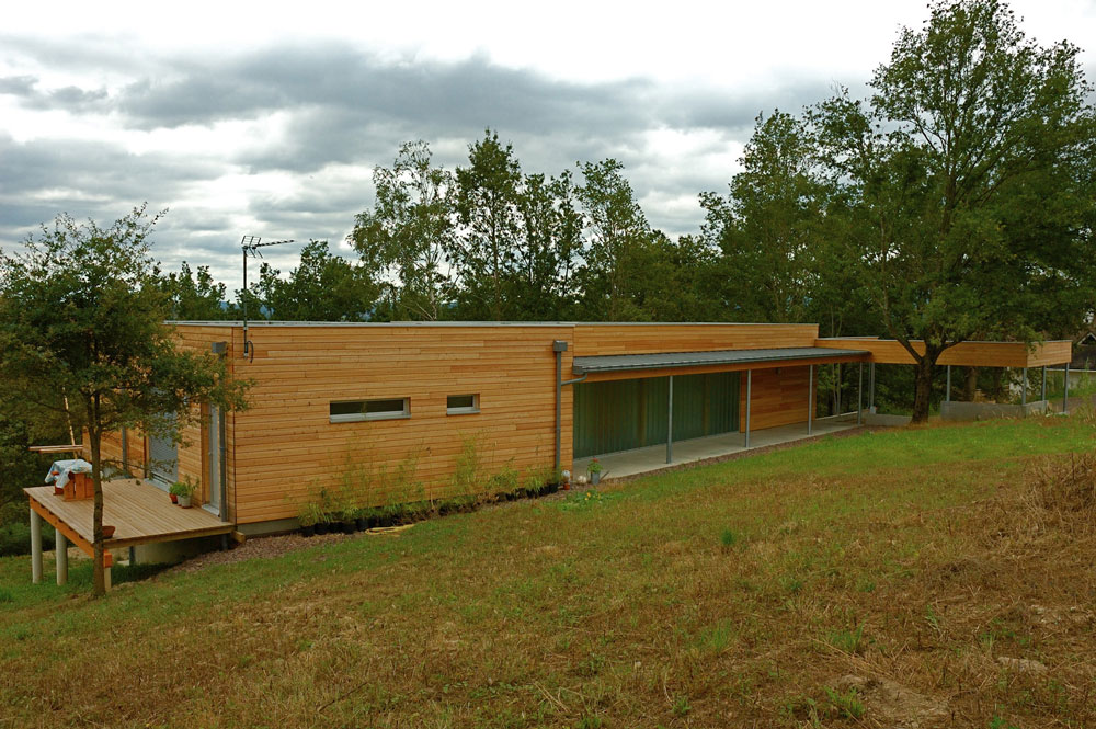 Cette maison à ossature bois surplombe un terrain arboré de 4000 m2 très pentu. L’ensemble domine le paysage de la région de Decazeville. L’accès depuis la rue se faisant par le haut, la toiture terrasse n’arrête pas le regard et se fond dans le paysage. L’ensemble de la construction est perché sur un système de pilotis en béton, ce qui évite de couteux travaux de terrassement et intègre au mieux cette construction d’un seul niveau. L’abri voiture repose quant à lui sur une partie maçonnée traditionnelle. Traitée en usine, la charpente se coiffe d’un toit terrasse en bac acier. L’isolation de la toiture se fait par l’extérieur. Elle combine 120mm de laine de roche compacte à une étanchéité monocouche. Le bardage est en mélèze raboté et laissé brut. Les lames sont clouées sur l’ossature isolée avec 110 mm de panneaux de plumes de canard. Logiquement, la maison se tourne vers le sud pour profiter d’une exposition au soleil et accumuler les calories en hiver. En été, les arbres la protège des rayons.