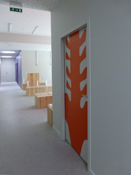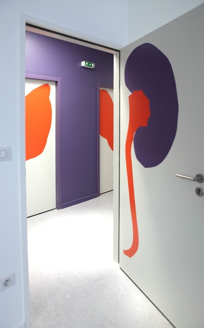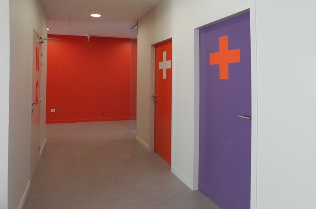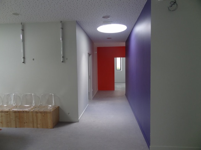 La couleur bleue des patios, en contrepoint du rouge de la brique est un élément dynamique qui ancre le bâtiment dans sa modernité et apporte de la luminosité dans un site à l’ombre une grande partie de l’année. À l’intérieur, tout un travail sur la couleur et la signalétique vient renouveler l’approche de l’accueil des patients dans un cadre chaleureux, fonctionnel et ludique. Les patients pourront bientôt découvrir ce lieu conçu pour leur bien-être.