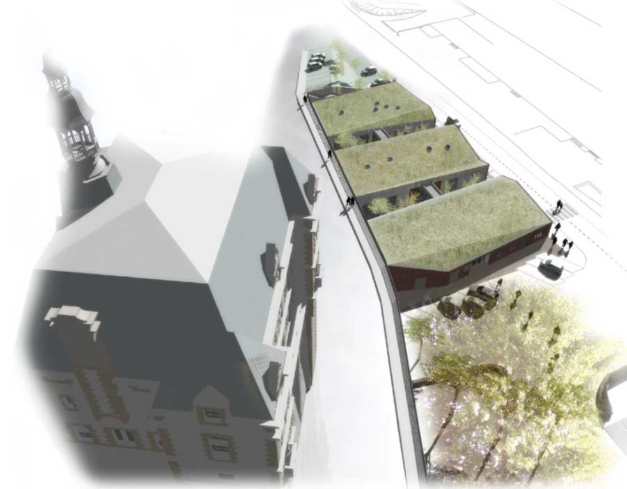 La toiture végétalisée affleure au niveau de l’avenue du 10 août et offre une « façade » qui viendra se fondre dans le paysage. Les pignons du bâtiment sont un hommage à la mémoire et à l’histoire industrielle du lieu. La brique comme une enceinte extérieure du bâtiment, vient rassembler les différents services de santé en une seule Maison de santé.