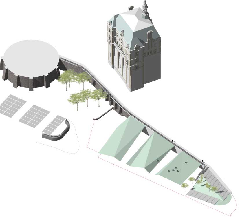 Le bâtiment vient s’inscrire en douceur, dans un gabarit juste, à l’emplacement de l’ancienne entrée du plateau des mines. L’entrée du bâtiment fait face à la zone du Centre, actuellement en chantier.
